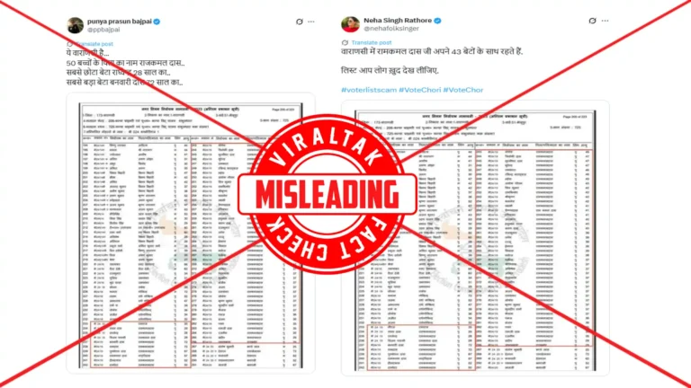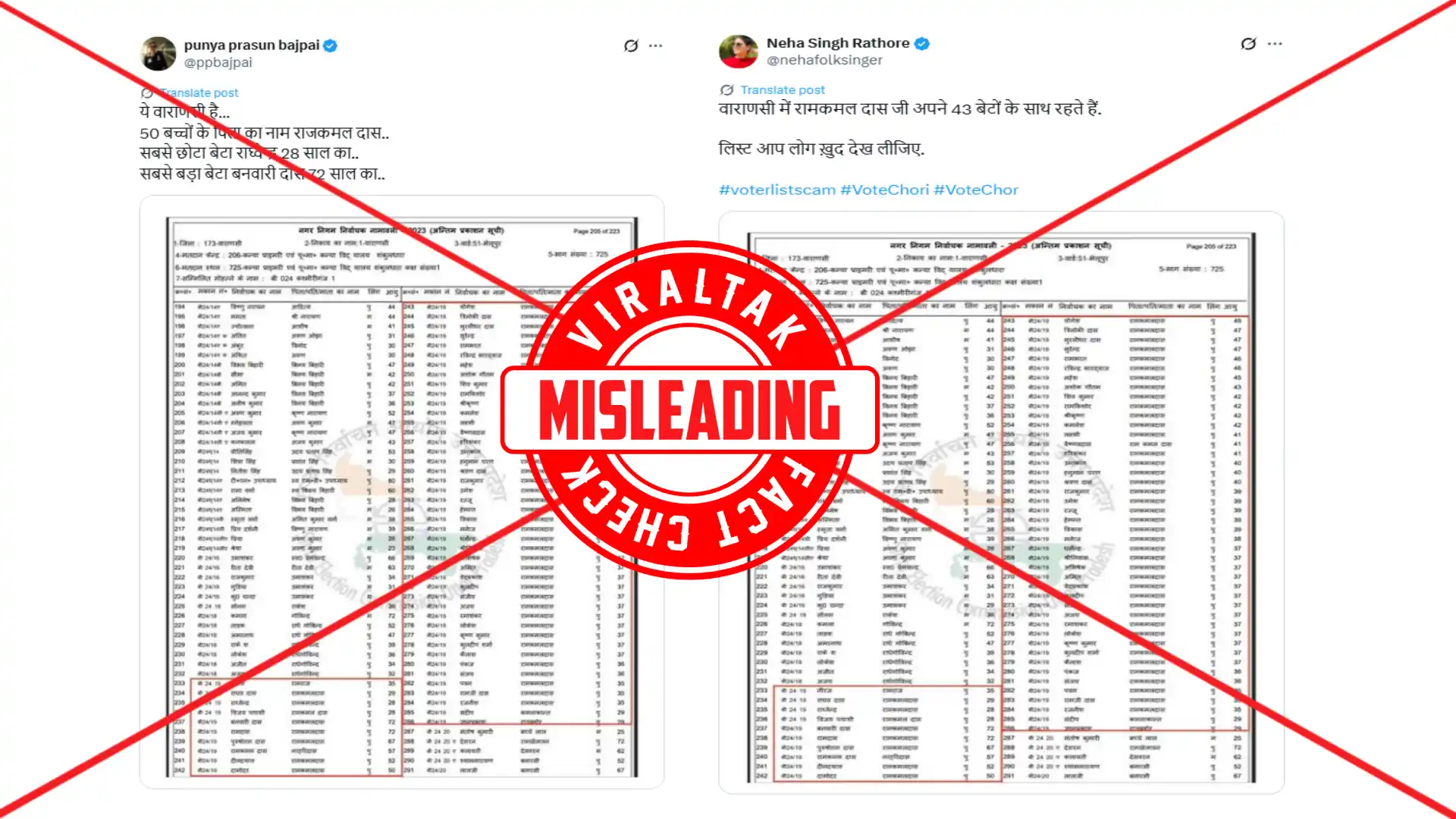 कांग्रेस समर्थक नेहा सिंह राठौर ने सोशल मीडिया प्लेटफॉर्म ‘एक्स’ पर #votechoriexposed #VoteChori #VoteChor जैसे हैशटैग के साथ वोटर लिस्ट की तस्वीर शेयर करते हुए कैप्शन में लिखा, “वाराणसी में रामकमल दास जी अपने घर में 43 बेटों के साथ रहते हैं. 13 एक साथ पैदा हुए, बाकियों की उम्र 35 से 49 साल के बीच है. ये मैं नहीं चुनाव आयोग कह रहा है. चुनाव आयोग की “निष्पक्षता और ईमानदारी” का ये दस्तावेज़ इतिहास में दर्ज़ होगा।”